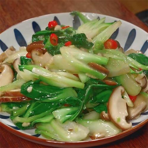 5. 炒至青菜变软,香菇熟透即可出锅。